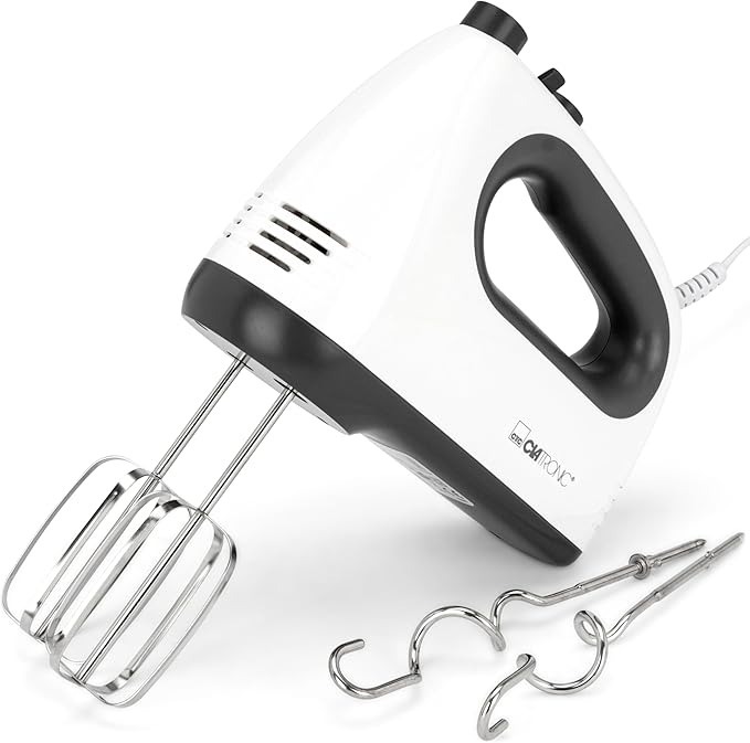 Funktionen & Zubehör: Ausgestattet mit 5 Geschwindigkeitsstufen sowie je zwei Rührbesen und Knethaken aus Edelstahl.