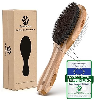 Bürstentyp und Verwendungszweck: 2-in-1 Hundebürste für Hunde und Katzen, die alle Felltypen mit Borsten und Nadeln entwirrt und pflegt.